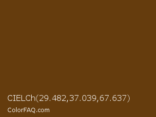CIELCh 29.482,37.039,67.637 Color is a very dark orange color and the nearest color is Pullman Brown UPS Brown #644117. Hex code #653c0d and RGB value is rgb(101,60,13). In RGB color space, this color is composed of 40% red, 24% green, 5% blue, In CMYK color space, this color is composed of 0% cyan, 41% magenta, 87% yellow , 60% black , In HSL color space, this color has a hue angle of 32° , 77% saturation and 22% lightness.