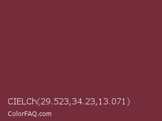 CIELCh 29.523,34.23,13.071 Color is a normal red color and the nearest color is Wine #722f37. Hex code #762d3b and RGB value is rgb(118,45,59). In RGB color space, this color is composed of 46% red, 18% green, 23% blue, In CMYK color space, this color is composed of 0% cyan, 62% magenta, 50% yellow , 54% black , In HSL color space, this color has a hue angle of 348° , 45% saturation and 32% lightness.