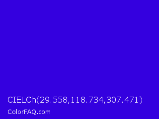 CIELCh 29.558,118.734,307.471 Color is a normal indigo color and the nearest color is Interdimensional Blue #360ccc. Hex code #3400df and RGB value is rgb(52,0,223). In RGB color space, this color is composed of 20% red, 0% green, 87% blue, In CMYK color space, this color is composed of 77% cyan, 100% magenta, 0% yellow , 13% black , In HSL color space, this color has a hue angle of 254° , 100% saturation and 44% lightness.
