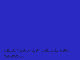 CIELCh 29.572,94.395,303.699 Color is a normal blue color and the nearest color is Persian Blue #1c39bb. Hex code #2a29c4 and RGB value is rgb(42,41,196). In RGB color space, this color is composed of 16% red, 16% green, 77% blue, In CMYK color space, this color is composed of 79% cyan, 79% magenta, 0% yellow , 23% black , In HSL color space, this color has a hue angle of 240° , 65% saturation and 46% lightness.