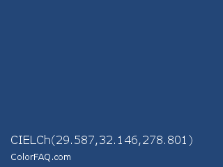CIELCh 29.587,32.146,278.801 Color is a dark blue color and the nearest color is Astronaut #283a77. Hex code #234677 and RGB value is rgb(35,70,119). In RGB color space, this color is composed of 14% red, 27% green, 47% blue, In CMYK color space, this color is composed of 71% cyan, 41% magenta, 0% yellow , 53% black , In HSL color space, this color has a hue angle of 215° , 55% saturation and 30% lightness.
