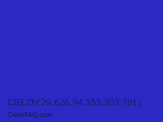 CIELCh 29.626,94.355,303.761 Color is a normal indigo color and the nearest color is Persian Blue #1c39bb. Hex code #2b29c4 and RGB value is rgb(43,41,196). In RGB color space, this color is composed of 17% red, 16% green, 77% blue, In CMYK color space, this color is composed of 78% cyan, 79% magenta, 0% yellow , 23% black , In HSL color space, this color has a hue angle of 241° , 65% saturation and 46% lightness.
