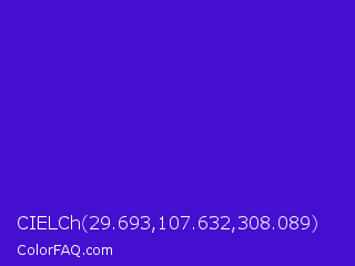 CIELCh 29.693,107.632,308.089 Color is a normal indigo color and the nearest color is Interdimensional Blue #360ccc. Hex code #450fcf and RGB value is rgb(69,15,207). In RGB color space, this color is composed of 27% red, 6% green, 81% blue, In CMYK color space, this color is composed of 67% cyan, 93% magenta, 0% yellow , 19% black , In HSL color space, this color has a hue angle of 257° , 86% saturation and 44% lightness.