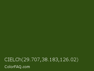 CIELCh 29.707,38.183,126.02 Color is a very dark green color and the nearest color is Clover #384910. Hex code #304e11 and RGB value is rgb(48,78,17). In RGB color space, this color is composed of 19% red, 31% green, 7% blue, In CMYK color space, this color is composed of 38% cyan, 0% magenta, 78% yellow , 69% black , In HSL color space, this color has a hue angle of 90° , 64% saturation and 19% lightness.