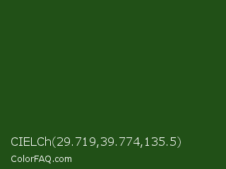 CIELCh 29.719,39.774,135.5 Color is a very dark green color and the nearest color is Green House #24500f. Hex code #215017 and RGB value is rgb(33,80,23). In RGB color space, this color is composed of 13% red, 31% green, 9% blue, In CMYK color space, this color is composed of 59% cyan, 0% magenta, 71% yellow , 69% black , In HSL color space, this color has a hue angle of 109° , 55% saturation and 20% lightness.