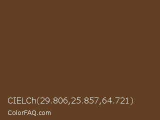 CIELCh 29.806,25.857,64.721 Color is a dark orange color and the nearest color is Irish Coffee #5f3d26. Hex code #603f22 and RGB value is rgb(96,63,34). In RGB color space, this color is composed of 38% red, 25% green, 13% blue, In CMYK color space, this color is composed of 0% cyan, 34% magenta, 65% yellow , 62% black , In HSL color space, this color has a hue angle of 28° , 48% saturation and 25% lightness.