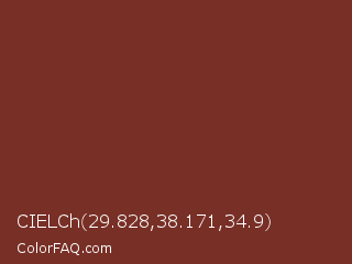 CIELCh 29.828,38.171,34.9 Color is a normal red color and the nearest color is Red Robin #80341f. Hex code #782f26 and RGB value is rgb(120,47,38). In RGB color space, this color is composed of 47% red, 18% green, 15% blue, In CMYK color space, this color is composed of 0% cyan, 61% magenta, 68% yellow , 53% black , In HSL color space, this color has a hue angle of 7° , 52% saturation and 31% lightness.
