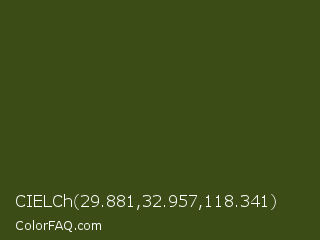 CIELCh 29.881,32.957,118.341 Color is a very dark lime color and the nearest color is Clover #384910. Hex code #3c4c16 and RGB value is rgb(60,76,22). In RGB color space, this color is composed of 24% red, 30% green, 9% blue, In CMYK color space, this color is composed of 21% cyan, 0% magenta, 71% yellow , 70% black , In HSL color space, this color has a hue angle of 78° , 55% saturation and 19% lightness.