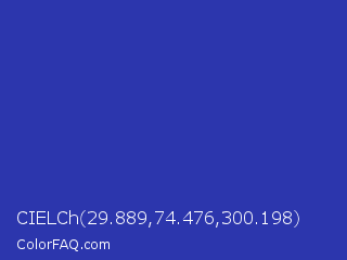 CIELCh 29.889,74.476,300.198 Color is a normal blue color and the nearest color is Governor Bay #2f3cb3. Hex code #2c36ad and RGB value is rgb(44,54,173). In RGB color space, this color is composed of 17% red, 21% green, 68% blue, In CMYK color space, this color is composed of 75% cyan, 69% magenta, 0% yellow , 32% black , In HSL color space, this color has a hue angle of 235° , 59% saturation and 43% lightness.