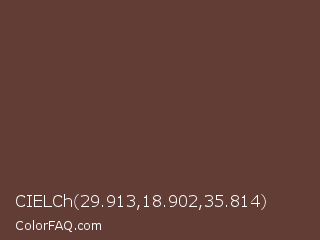 CIELCh 29.913,18.902,35.814 Color is a dark red color and the nearest color is Quincy #623f2d. Hex code #623d36 and RGB value is rgb(98,61,54). In RGB color space, this color is composed of 38% red, 24% green, 21% blue, In CMYK color space, this color is composed of 0% cyan, 38% magenta, 45% yellow , 62% black , In HSL color space, this color has a hue angle of 10° , 29% saturation and 30% lightness.