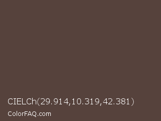 CIELCh 29.914,10.319,42.381 Color is a dark red color and the nearest color is Dark Liver Horses #543d37. Hex code #56423c and RGB value is rgb(86,66,60). In RGB color space, this color is composed of 34% red, 26% green, 24% blue, In CMYK color space, this color is composed of 0% cyan, 23% magenta, 30% yellow , 66% black , In HSL color space, this color has a hue angle of 14° , 18% saturation and 29% lightness.
