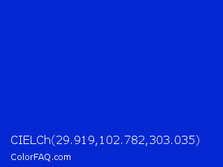 CIELCh 29.919,102.782,303.035 Color is a normal blue color and the nearest color is Persian Blue #1c39bb. Hex code #0528d2 and RGB value is rgb(5,40,210). In RGB color space, this color is composed of 2% red, 16% green, 82% blue, In CMYK color space, this color is composed of 98% cyan, 81% magenta, 0% yellow , 18% black , In HSL color space, this color has a hue angle of 230° , 95% saturation and 42% lightness.