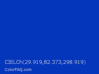 CIELCh 29.919,82.373,298.919 Color is a normal blue color and the nearest color is UA Blue #0033aa. Hex code #0336ba and RGB value is rgb(3,54,186). In RGB color space, this color is composed of 1% red, 21% green, 73% blue, In CMYK color space, this color is composed of 98% cyan, 71% magenta, 0% yellow , 27% black , In HSL color space, this color has a hue angle of 223° , 97% saturation and 37% lightness.