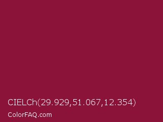 CIELCh 29.929,51.067,12.354 Color is a normal rose color and the nearest color is Claret #7f1734. Hex code #8b1238 and RGB value is rgb(139,18,56). In RGB color space, this color is composed of 55% red, 7% green, 22% blue, In CMYK color space, this color is composed of 0% cyan, 87% magenta, 60% yellow , 45% black , In HSL color space, this color has a hue angle of 341° , 77% saturation and 31% lightness.