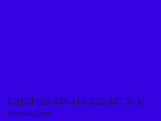 CIELCh 29.936,119.232,307.373 Color is a normal indigo color and the nearest color is Interdimensional Blue #360ccc. Hex code #3402e1 and RGB value is rgb(52,2,225). In RGB color space, this color is composed of 20% red, 1% green, 88% blue, In CMYK color space, this color is composed of 77% cyan, 99% magenta, 0% yellow , 12% black , In HSL color space, this color has a hue angle of 253° , 98% saturation and 45% lightness.