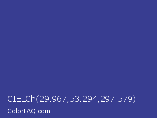CIELCh 29.967,53.294,297.579 Color is a normal blue color and the nearest color is Blue Pigment #333399. Hex code #383d91 and RGB value is rgb(56,61,145). In RGB color space, this color is composed of 22% red, 24% green, 57% blue, In CMYK color space, this color is composed of 61% cyan, 58% magenta, 0% yellow , 43% black , In HSL color space, this color has a hue angle of 237° , 44% saturation and 39% lightness.