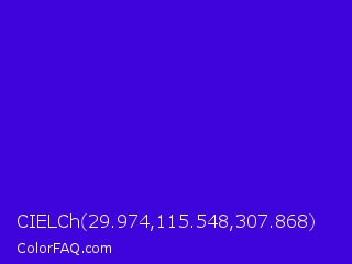 CIELCh 29.974,115.548,307.868 Color is a normal indigo color and the nearest color is Interdimensional Blue #360ccc. Hex code #3e04db and RGB value is rgb(62,4,219). In RGB color space, this color is composed of 24% red, 2% green, 86% blue, In CMYK color space, this color is composed of 72% cyan, 98% magenta, 0% yellow , 14% black , In HSL color space, this color has a hue angle of 256° , 96% saturation and 44% lightness.
