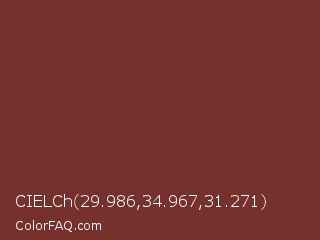 CIELCh 29.986,34.967,31.271 Color is a normal red color and the nearest color is Wine #722f37. Hex code #76312c and RGB value is rgb(118,49,44). In RGB color space, this color is composed of 46% red, 19% green, 17% blue, In CMYK color space, this color is composed of 0% cyan, 58% magenta, 63% yellow , 54% black , In HSL color space, this color has a hue angle of 4° , 46% saturation and 32% lightness.