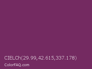 CIELCh 29.99,42.615,337.178 Color is a normal magenta color and the nearest color is Byzantium #702963. Hex code #742a61 and RGB value is rgb(116,42,97). In RGB color space, this color is composed of 45% red, 16% green, 38% blue, In CMYK color space, this color is composed of 0% cyan, 64% magenta, 16% yellow , 55% black , In HSL color space, this color has a hue angle of 315° , 47% saturation and 31% lightness.