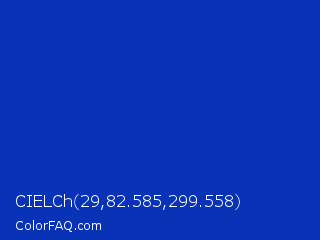 CIELCh 29,82.585,299.558 Color is a normal blue color and the nearest color is UA Blue #0033aa. Hex code #0833b7 and RGB value is rgb(8,51,183). In RGB color space, this color is composed of 3% red, 20% green, 72% blue, In CMYK color space, this color is composed of 96% cyan, 72% magenta, 0% yellow , 28% black , In HSL color space, this color has a hue angle of 225° , 92% saturation and 37% lightness.