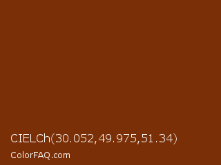 CIELCh 30.052,49.975,51.34 Color is a dark orange color and the nearest color is Red Beech #7b3801. Hex code #7b2f06 and RGB value is rgb(123,47,6). In RGB color space, this color is composed of 48% red, 18% green, 2% blue, In CMYK color space, this color is composed of 0% cyan, 62% magenta, 95% yellow , 52% black , In HSL color space, this color has a hue angle of 21° , 91% saturation and 25% lightness.