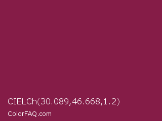 CIELCh 30.089,46.668,1.2 Color is a normal rose color and the nearest color is Disco #871550. Hex code #851c47 and RGB value is rgb(133,28,71). In RGB color space, this color is composed of 52% red, 11% green, 28% blue, In CMYK color space, this color is composed of 0% cyan, 79% magenta, 47% yellow , 48% black , In HSL color space, this color has a hue angle of 335° , 65% saturation and 32% lightness.