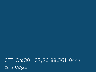 CIELCh 30.127,26.88,261.044 Color is a dark blue color and the nearest color is Dark Cerulean #08457e. Hex code #0d4b70 and RGB value is rgb(13,75,112). In RGB color space, this color is composed of 5% red, 29% green, 44% blue, In CMYK color space, this color is composed of 88% cyan, 33% magenta, 0% yellow , 56% black , In HSL color space, this color has a hue angle of 202° , 79% saturation and 25% lightness.