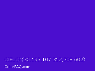 CIELCh 30.193,107.312,308.602 Color is a normal indigo color and the nearest color is Interdimensional Blue #360ccc. Hex code #4b0ecf and RGB value is rgb(75,14,207). In RGB color space, this color is composed of 29% red, 5% green, 81% blue, In CMYK color space, this color is composed of 64% cyan, 93% magenta, 0% yellow , 19% black , In HSL color space, this color has a hue angle of 259° , 87% saturation and 43% lightness.