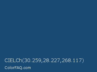 CIELCh 30.259,28.227,268.117 Color is a dark blue color and the nearest color is Chathams Blue #175579. Hex code #194a73 and RGB value is rgb(25,74,115). In RGB color space, this color is composed of 10% red, 29% green, 45% blue, In CMYK color space, this color is composed of 78% cyan, 36% magenta, 0% yellow , 55% black , In HSL color space, this color has a hue angle of 207° , 64% saturation and 27% lightness.