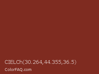 CIELCh 30.264,44.355,36.5 Color is a normal red color and the nearest color is Red Robin #80341f. Hex code #7f2b20 and RGB value is rgb(127,43,32). In RGB color space, this color is composed of 50% red, 17% green, 13% blue, In CMYK color space, this color is composed of 0% cyan, 66% magenta, 75% yellow , 50% black , In HSL color space, this color has a hue angle of 7° , 60% saturation and 31% lightness.