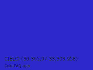 CIELCh 30.365,97.33,303.958 Color is a normal indigo color and the nearest color is Persian Blue #1c39bb. Hex code #2c29ca and RGB value is rgb(44,41,202). In RGB color space, this color is composed of 17% red, 16% green, 79% blue, In CMYK color space, this color is composed of 78% cyan, 80% magenta, 0% yellow , 21% black , In HSL color space, this color has a hue angle of 241° , 66% saturation and 48% lightness.