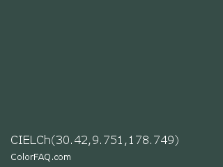 CIELCh 30.42,9.751,178.749 Color is a dark cyan color and the nearest color is Arsenic #3b444b. Hex code #364c47 and RGB value is rgb(54,76,71). In RGB color space, this color is composed of 21% red, 30% green, 28% blue, In CMYK color space, this color is composed of 29% cyan, 0% magenta, 7% yellow , 70% black , In HSL color space, this color has a hue angle of 166° , 17% saturation and 25% lightness.