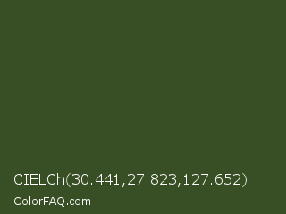 CIELCh 30.441,27.823,127.652 Color is a very dark green color and the nearest color is Kombu Green #354230. Hex code #384e24 and RGB value is rgb(56,78,36). In RGB color space, this color is composed of 22% red, 31% green, 14% blue, In CMYK color space, this color is composed of 28% cyan, 0% magenta, 54% yellow , 69% black , In HSL color space, this color has a hue angle of 91° , 37% saturation and 22% lightness.
