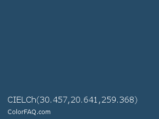 CIELCh 30.457,20.641,259.368 Color is a dark blue color and the nearest color is San Juan #304b6a. Hex code #264b67 and RGB value is rgb(38,75,103). In RGB color space, this color is composed of 15% red, 29% green, 40% blue, In CMYK color space, this color is composed of 63% cyan, 27% magenta, 0% yellow , 60% black , In HSL color space, this color has a hue angle of 206° , 46% saturation and 28% lightness.