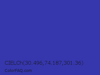 CIELCh 30.496,74.187,301.36 Color is a normal blue color and the nearest color is Governor Bay #2f3cb3. Hex code #3636ad and RGB value is rgb(54,54,173). In RGB color space, this color is composed of 21% red, 21% green, 68% blue, In CMYK color space, this color is composed of 69% cyan, 69% magenta, 0% yellow , 32% black , In HSL color space, this color has a hue angle of 240° , 52% saturation and 45% lightness.