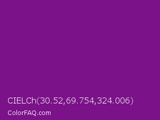 CIELCh 30.52,69.754,324.006 Color is a dark magenta color and the nearest color is Seance #731e8f. Hex code #7b1289 and RGB value is rgb(123,18,137). In RGB color space, this color is composed of 48% red, 7% green, 54% blue, In CMYK color space, this color is composed of 10% cyan, 87% magenta, 0% yellow , 46% black , In HSL color space, this color has a hue angle of 293° , 77% saturation and 30% lightness.