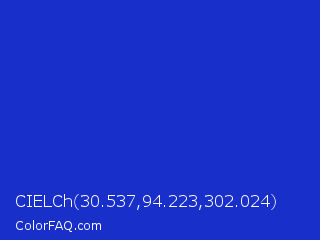 CIELCh 30.537,94.223,302.024 Color is a normal blue color and the nearest color is Persian Blue #1c39bb. Hex code #192fc9 and RGB value is rgb(25,47,201). In RGB color space, this color is composed of 10% red, 18% green, 79% blue, In CMYK color space, this color is composed of 88% cyan, 77% magenta, 0% yellow , 21% black , In HSL color space, this color has a hue angle of 233° , 78% saturation and 44% lightness.