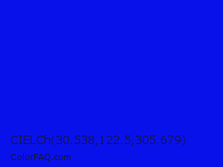 CIELCh 30.538,122.5,305.679 Color is a normal blue color and the nearest color is Bluebonnet #1c1cf0. Hex code #0911eb and RGB value is rgb(9,17,235). In RGB color space, this color is composed of 4% red, 7% green, 92% blue, In CMYK color space, this color is composed of 96% cyan, 93% magenta, 0% yellow , 8% black , In HSL color space, this color has a hue angle of 238° , 93% saturation and 48% lightness.