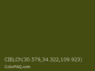 CIELCh 30.579,34.322,109.923 Color is a very dark yellow color and the nearest color is Clover #384910. Hex code #454c11 and RGB value is rgb(69,76,17). In RGB color space, this color is composed of 27% red, 30% green, 7% blue, In CMYK color space, this color is composed of 9% cyan, 0% magenta, 78% yellow , 70% black , In HSL color space, this color has a hue angle of 67° , 63% saturation and 18% lightness.