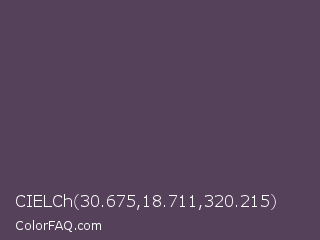 CIELCh 30.675,18.711,320.215 Color is a normal purple color and the nearest color is English Violet #563c5c. Hex code #56415b and RGB value is rgb(86,65,91). In RGB color space, this color is composed of 34% red, 25% green, 36% blue, In CMYK color space, this color is composed of 5% cyan, 29% magenta, 0% yellow , 64% black , In HSL color space, this color has a hue angle of 288° , 17% saturation and 31% lightness.