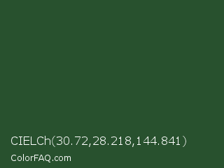 CIELCh 30.72,28.218,144.841 Color is a dark green color and the nearest color is Cal Poly Pomona Green #1e4d2b. Hex code #28512e and RGB value is rgb(40,81,46). In RGB color space, this color is composed of 16% red, 32% green, 18% blue, In CMYK color space, this color is composed of 51% cyan, 0% magenta, 43% yellow , 68% black , In HSL color space, this color has a hue angle of 129° , 34% saturation and 24% lightness.
