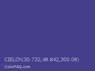 CIELCh 30.732,48.842,300.08 Color is a normal indigo color and the nearest color is Dark Slate Blue #483d8b. Hex code #443e8b and RGB value is rgb(68,62,139). In RGB color space, this color is composed of 27% red, 24% green, 55% blue, In CMYK color space, this color is composed of 51% cyan, 55% magenta, 0% yellow , 45% black , In HSL color space, this color has a hue angle of 245° , 38% saturation and 39% lightness.