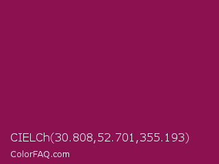 CIELCh 30.808,52.701,355.193 Color is a normal rose color and the nearest color is Disco #871550. Hex code #8c1151 and RGB value is rgb(140,17,81). In RGB color space, this color is composed of 55% red, 7% green, 32% blue, In CMYK color space, this color is composed of 0% cyan, 88% magenta, 42% yellow , 45% black , In HSL color space, this color has a hue angle of 329° , 78% saturation and 31% lightness.