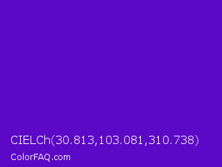 CIELCh 30.813,103.081,310.738 Color is a normal violet color and the nearest color is Interdimensional Blue #360ccc. Hex code #5c08c7 and RGB value is rgb(92,8,199). In RGB color space, this color is composed of 36% red, 3% green, 78% blue, In CMYK color space, this color is composed of 54% cyan, 96% magenta, 0% yellow , 22% black , In HSL color space, this color has a hue angle of 266° , 92% saturation and 41% lightness.
