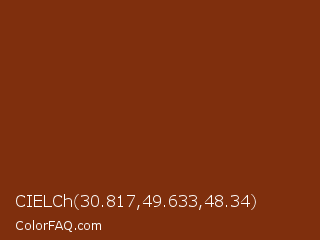 CIELCh 30.817,49.633,48.34 Color is a dark orange color and the nearest color is Smokey Topaz #832a0d. Hex code #7f2f0d and RGB value is rgb(127,47,13). In RGB color space, this color is composed of 50% red, 18% green, 5% blue, In CMYK color space, this color is composed of 0% cyan, 63% magenta, 90% yellow , 50% black , In HSL color space, this color has a hue angle of 18° , 81% saturation and 27% lightness.