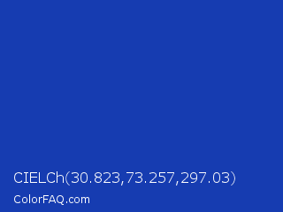 CIELCh 30.823,73.257,297.03 Color is a normal blue color and the nearest color is Persian Blue #1c39bb. Hex code #163cb1 and RGB value is rgb(22,60,177). In RGB color space, this color is composed of 9% red, 24% green, 69% blue, In CMYK color space, this color is composed of 88% cyan, 66% magenta, 0% yellow , 31% black , In HSL color space, this color has a hue angle of 225° , 78% saturation and 39% lightness.