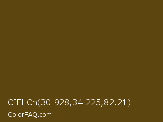 CIELCh 30.928,34.225,82.21 Color is a very dark orange color and the nearest color is Horses Neck #604913. Hex code #5d4510 and RGB value is rgb(93,69,16). In RGB color space, this color is composed of 36% red, 27% green, 6% blue, In CMYK color space, this color is composed of 0% cyan, 26% magenta, 83% yellow , 64% black , In HSL color space, this color has a hue angle of 41° , 71% saturation and 21% lightness.