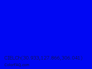 CIELCh 30.933,127.866,306.041 Color is a normal blue color and the nearest color is Blue #0000ff. Hex code #0007f3 and RGB value is rgb(0,7,243). In RGB color space, this color is composed of 0% red, 3% green, 95% blue, In CMYK color space, this color is composed of 100% cyan, 97% magenta, 0% yellow , 5% black , In HSL color space, this color has a hue angle of 238° , 100% saturation and 48% lightness.