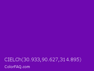CIELCh 30.933,90.627,314.895 Color is a normal purple color and the nearest color is Violet RYB #8601af. Hex code #6e08b0 and RGB value is rgb(110,8,176). In RGB color space, this color is composed of 43% red, 3% green, 69% blue, In CMYK color space, this color is composed of 38% cyan, 95% magenta, 0% yellow , 31% black , In HSL color space, this color has a hue angle of 276° , 91% saturation and 36% lightness.
