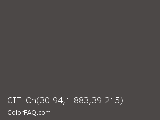 CIELCh 30.94,1.883,39.215 Color is a dark red color and the nearest color is Emperor #514649. Hex code #4c4847 and RGB value is rgb(76,72,71). In RGB color space, this color is composed of 30% red, 28% green, 28% blue, In CMYK color space, this color is composed of 0% cyan, 5% magenta, 7% yellow , 70% black , In HSL color space, this color has a hue angle of 12° , 3% saturation and 29% lightness.